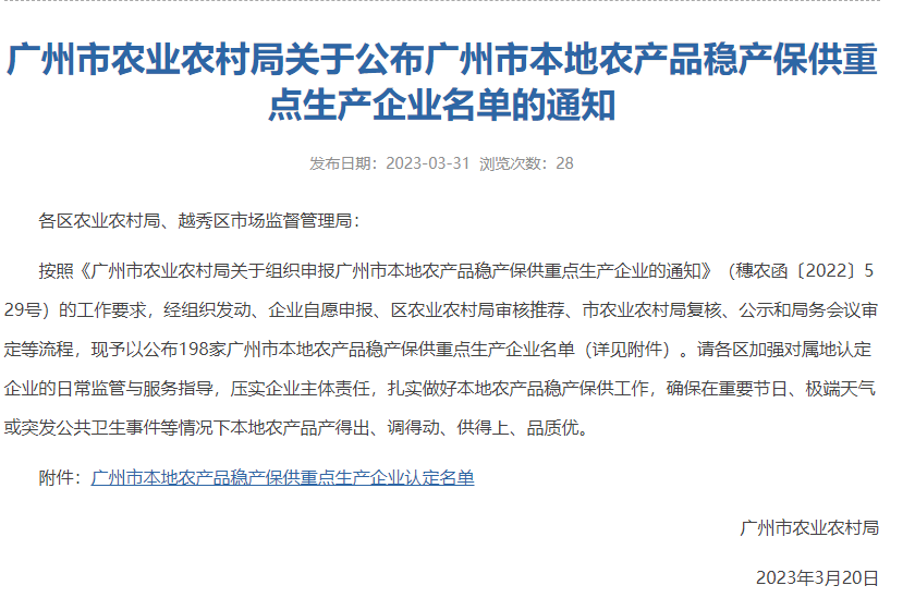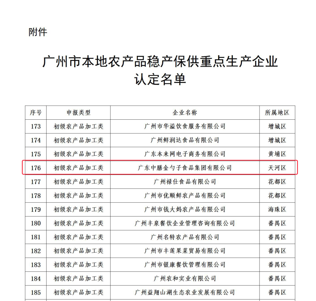 2023年3月31日,廣州市農(nóng)業(yè)農(nóng)村局在官網(wǎng)公布了一批農(nóng)產(chǎn)品穩(wěn)產(chǎn)保供重點(diǎn)生產(chǎn)企業(yè)名單(共198家),其中“廣東中膳金勺子食品集團(tuán)有限公司”被認(rèn)定為“初級農(nóng)產(chǎn)品加工類”穩(wěn)產(chǎn)保供重點(diǎn)生產(chǎn)企業(yè)。