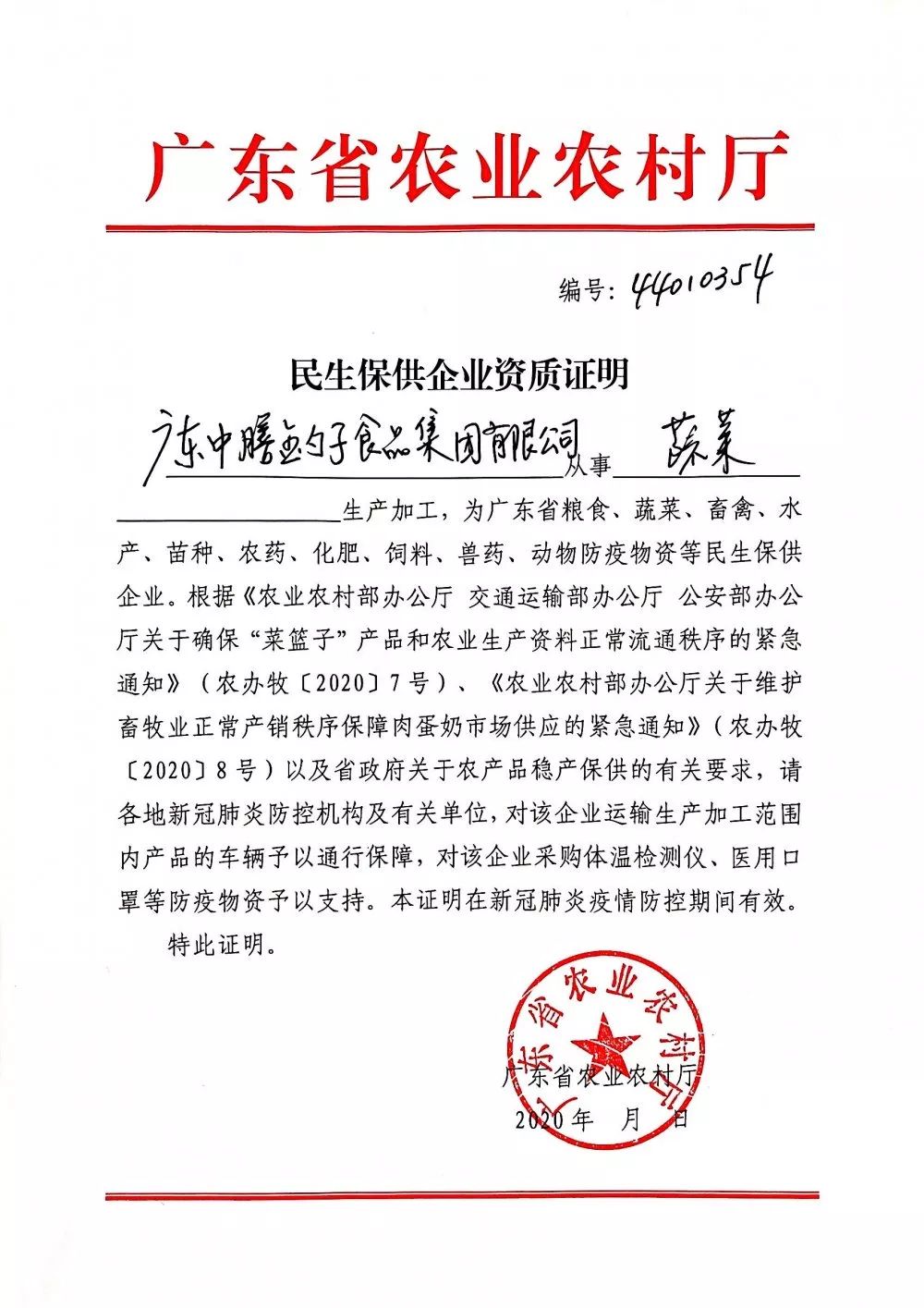 疫情期間,為落實民生保障工作,多地政府部門在行動。省農業農村廳為保障特殊時期農產品及農業生產資料有序流通,保證農產品有效供給,為農產品和農業生產資料加工企業,開具優先“綠色通道”證明!率先獲得民生保供企業資質證明近日,中膳金勺子食品集團率先獲得省農業農村廳開具的“民生保供企業資質證明”。證明顯示:廣